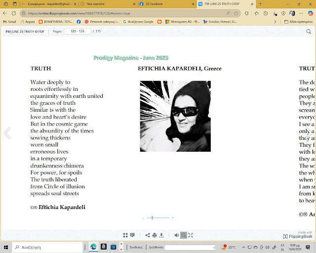 Το Αρχείο Ποίησής μας Έκδοση 11 N 5 Αυγούστου 2025: Είναι τώρα online! Αυτόν τον μήνα παρουσιάζουμε περισσότερα από 150 ποιήματα 50 ποιητών από όλο τον κόσμο. Αυτόν τον μήνα είμαστε στην ευχάριστη θέση να σας παρουσιάσουμε την ποιήτρια ΕΜΙΛΙΑ ΤΟΝΤΟΡΟΒΑ από την Αυστραλία , ως « Ποιητής του Μήνα ». Ορίστε ο σύνδεσμος του τεύχους στο διαδίκτυο: < https://ourpoetryarchive.blogspot.com >